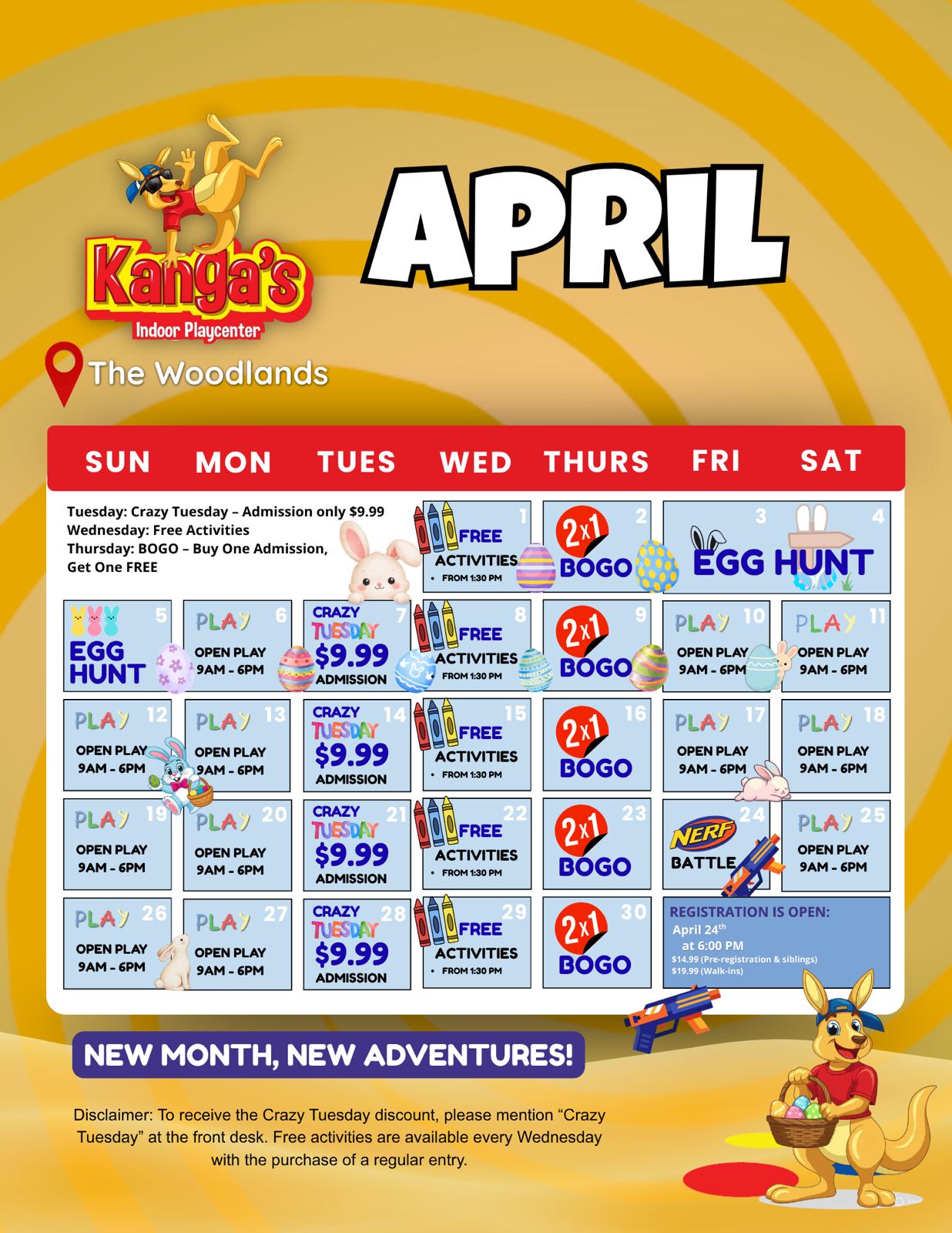 Check out our April Calendar with many awesome discounts and activities! We welcome you to a new expirence here at Kangas with our new managment, new attractions, and more to come. Let us make your day fun and stress free!